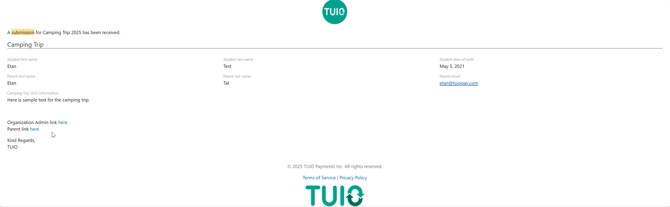 When a student is enrolled in a program and the parent is notified, the parent will be sent an automated email - with your school information - that the student has been enrolled in a program and can set up payment. If they have yet to activate the account they will receive their activation link to TUIO this way.