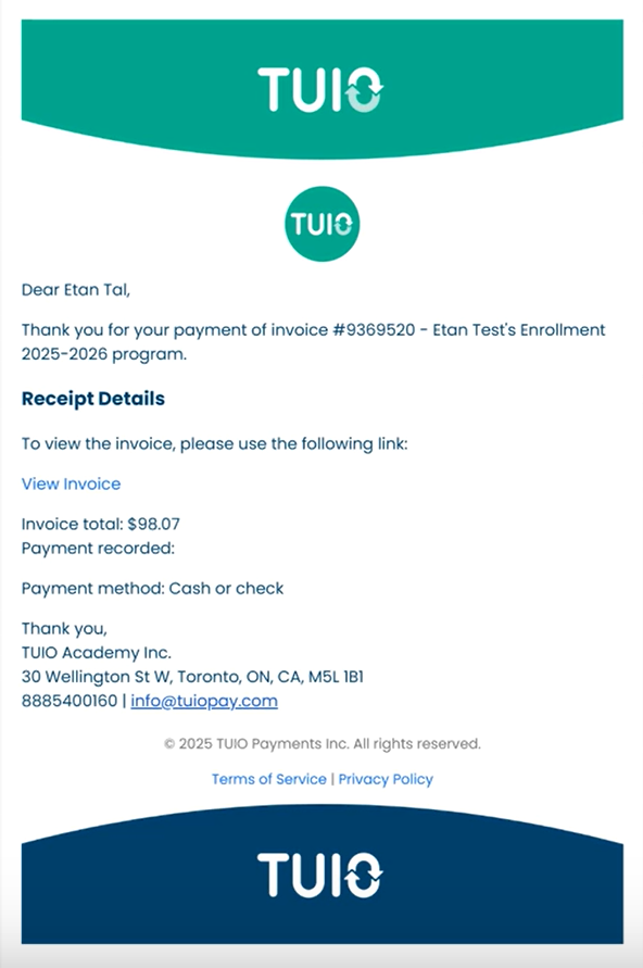 When an invoice is processed as paid on TUIO, parents receive an email notifying them of this. The parent can view the receipt on the invoice and it is linked to their account to view it on demand.